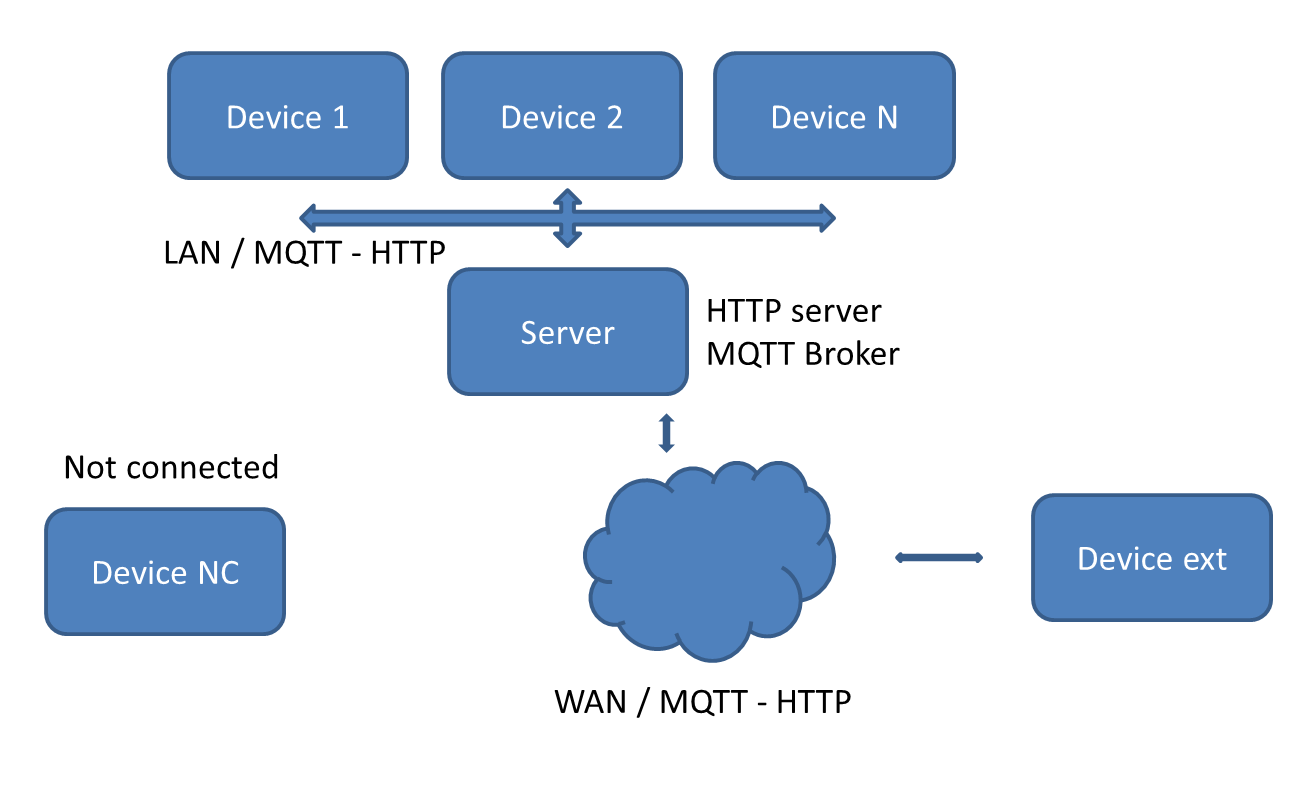 L'idée est que chaque module dispose d'un peu d'intelligence pour effectuer les tâches qui lui sont demandées, et il peut rendre compte des taches vers un serveur, mais il peut aussi communiquer avec les autres modules, ou tout faire tout seul.