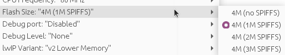 4) Sélectionner la partition de la flash dans le menu Tools (choisir la partition SPIFFS la plus petite)