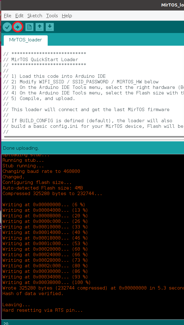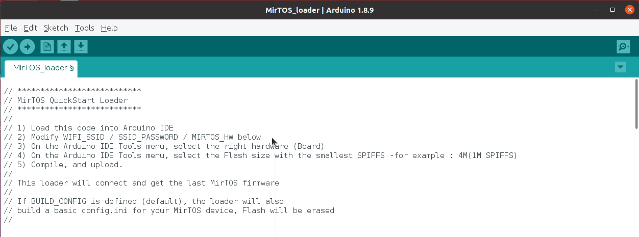 1) Il faut télécharger le petit programme de chargement sur l'URL http://www.mirtos.org/quickstart/MirTOS_loader.ino et le charger dans l'IDE Arduino