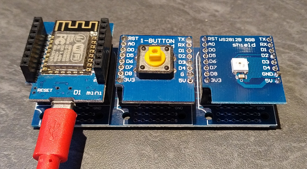 Pour cet exemple, on a utilisé un WeMos D1 avec un shield 'bouton' et un shield 'LED' (le même exemple peut être utilisé avec un shield bouton et un shield relay, sans problème)