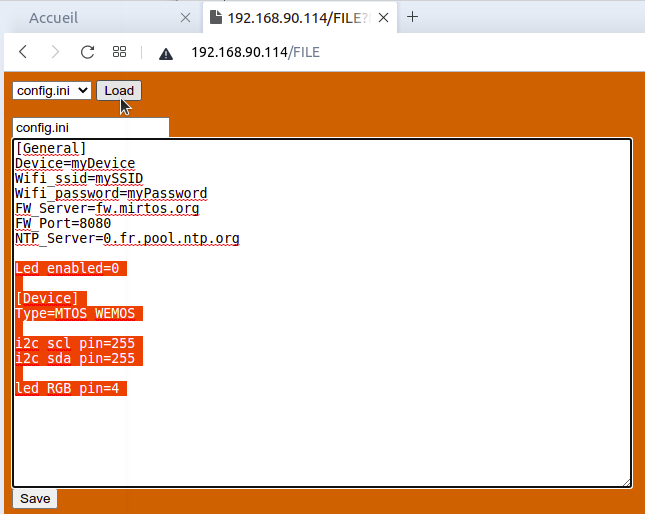 - désactiver l'I2C (car sur le WeMos, les lignes I2C utilisent, par défaut, la ligne D2, qui est aussi celle utilisée par le shield LED). Pour le faire il faut ajouter dans la section [Device] les lignes i2c_scl_pin=255 et i2c_sda_pin=255