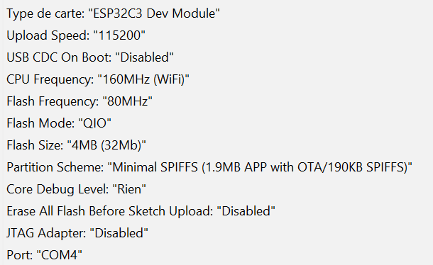 Dans le cas de l'usage d'un chip ESP8685, il faut utiliser la configuration suivante (au lieu de ESP32_C3):